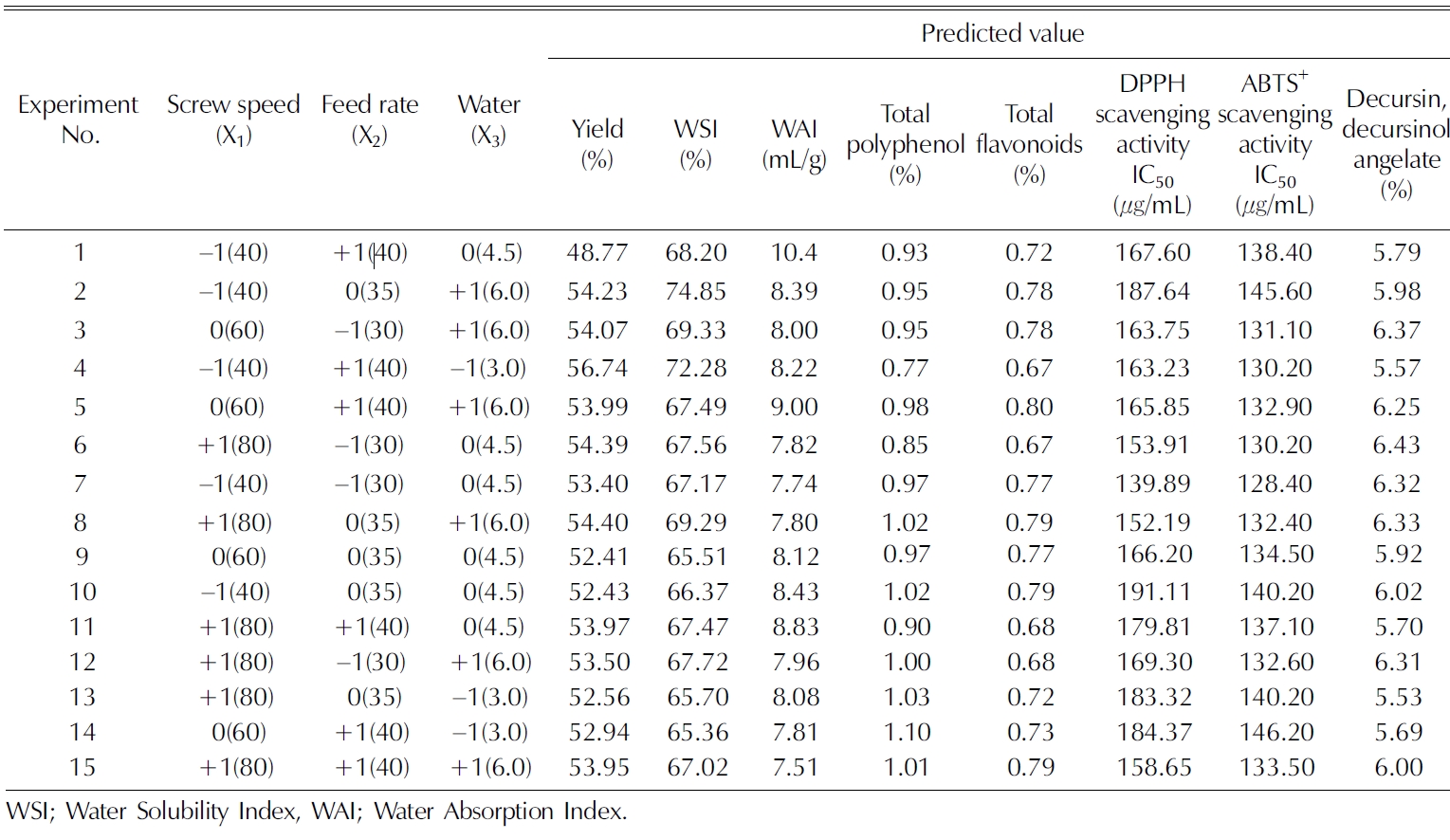 압출성형 참당귀 미분은 쌍축압출성형장치 (DNDL-44, Buhler Brothers Co., Uzill, Switzerland)를 이용하여 지름이 3mm인 원형 사출구 하나를 열어 압출성형 하였다 (Fig. 1). 강한 층 밀림을 유도하기 위해 3개의 역방향 스크류를 조합하 였으며 참당귀 분말을 일정하게 (140kg/h) 투입하여 가수량을 변화시키며 압출성형 하였다. 이 때 바렐은 150°C 고정하여 유지하였다. 식물의 세포벽 성분을 수용화하기 위해서는 강한 전단응력 및 마찰열을 필요로 하기 때문에 압출성형 조건을 Table 1과 같이 설정하였다. 압출성형 시 온도와 압력을 측정 하고자 사출구와 스크류 전면사이에 열전대 및 변화기를 통하 여 압출성형 온도와 압력을 측정하였다. 요인변수에 따른 변화 양상은 압출온도와 기계적 소모 에너지 (Specific Mechanical Energy Input, SME)로 조사하였다. 또한 추출물의 특성을 최대 로 하는 추출조건을 설정하기 위해 반응표면분석법 (Response Surface Methodology, RSM)을 사용하였다 (Gontard et al., 1992). 추출조건에 대한 실험계획은 중심합성계획 (Central composite design)을 사용하였으며, 반응표면분석을 위해 SAS (Statistical Analysis System)를 사용하였다. 실험계획은 Table 2와 같이 추출공정에서 중요한 변수인 압출성형기의 스크류 속도 (40 ~ 80 rpm, X1), 원료 투입량 (30 ~ 40kg/h, X2), 가 수량 (3.0 ~ 6.0kg, X3)를 −1, 0, 1의 3단계로 부호화하여 중 심합성계획에 따라 Table 3과 같이 15구간으로 설정하여 추출 실험을 실시하였다. 또한 이들 요인변수에 의해 영향을 받는 종속변수 (Yn) 즉, 수율, 수분용해지수, 수분흡착지수, 총 폴리 페놀함량, 총 플라보노이드함량, DPPH 라디칼 소거능, ABTS 라디칼 소거능, decursin과 decursinol angelate 함량으로 하였 으며, 이들은 3회 반복 측정하여 그 평균값을 회귀분석에 사 용하였다.