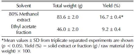 황백을 80% methanol을 이용하여 가열 추출한 결과, 황백 500 g 기준 동결 건조 분말 중량은 83.6 g이었고 수율 16.7% 로 나타났다. 이 중 ethyl acetate로 분획하여 얻은 분획물의 동결 건조 분말 중량은 46.0 g으로 9.2%의 수율을 나타내었다 (Table. 1).