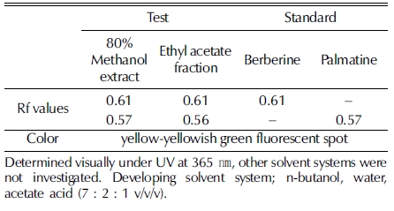 Silica gel TLC plate 상에서 전개된 황백 추출물 및 분획 물과 지표 물질 berberine, palmatine의 이동에 따른 고유수치 (Rf 값)를 UV 365㎚ 파장에서 육안 관찰한 결과는 Fig. 1과 같다. 추출물과 분획물 모두 형광 노란색–청록색의 spot이 관 찰되었고, 추출물의 경우 2개 spot의 Rf 값은 각 0.61과 0.57 이었으며, 분획물의 경우 형광 노란색–청록색을 띠는 2 개 spot의 Rf 값은 각 0.61과 0.56으로 확인되었다. 대조 시료인 지표 물질 berberine과 palmatine은 형광 노란색–청록색을 띠 는 spot으로 각각의 Rf 값은 0.61, 0.57으로 나타났으며, 이는 황백 추출물 및 분획물에서 관찰된 각 2개의 spot과 색상이 일치하고 Rf 값이 유사한 것으로 확인되었다. 이를 통해 황백 추출물 및 분획물에서 지표 물질 berberine과 palmatine이 모 두 함유되어 있음을 확인하였으며, 두 지표 물질은 용매 methanol과 ethyl acetate에 의해 용출 가능한 물질임이 확인되 었다 (Table. 2).