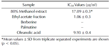 Elastase inhibitions of extract, fraction, berberine, palmatine and oleanolic acid.*Mean values ± SD from triplicate separated experiments are shown (p < 0.05).
