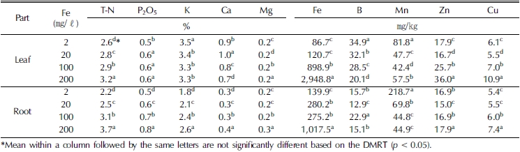 뿌리가 무르고 썩는 증상이 나타나기 시작한 철 100 ㎎/ℓ 처리 시 철 함량은 275.2㎎/㎏ 으로 증상이 나타나지 않았던 철 20㎎/ℓ 처리 시 철 함량 280.2㎎/㎏와 유의한 차이가 없었는데 이에 관해서는 흡수된 원소 함량 외에 다른 원인이 있을 것으로 추정되며 추후 연구가 필요할 것으로 보인다. 철 함량이 증가할수록 망간 함량은 감소한 반면 총 질소, 인산, 칼륨, 칼슘, 구리의 함량은 증가하였다. 잎과 뿌리의 식물체 분 석을 종합해보면, 인삼에 철 과잉 증상이 발생하는 철 농도는 잎은 약 120㎎/㎏, 뿌리는 약 270㎎/㎏ 전후로 생각된다.