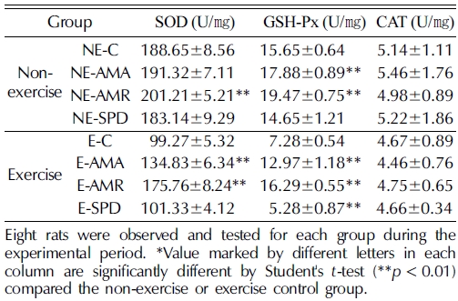 체내 활성 산소종를 제거하는 데 중요한 효소인 GSH-Px의 경우에서는 비 운동계열이라 할지라도 황기 지상부 다당체 투 여군 및 황기 뿌리 다당체 투여군에서 효소활성이 통계적으로 증가하는 경향을 나타내었으며 운동계열의 경우에서도 감소된 GSH-Px 효소활성이 회복되는 것을 확인하였다 (Table 1).