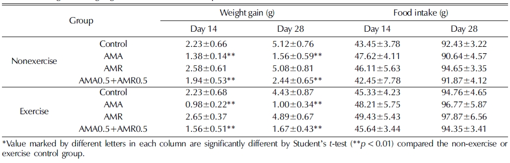 실험기간 동안 대조군과 비교하여 황기 뿌리 다당체 투여한 군은 운동 유무의 상관없이 14 일, 28 일 모두에서 체중의 유의적 감소를 나타내지 않은 반면 황기 지상부 다당체 투여 를 병행한 군에서 역시 운동 유무에 관계없이 14 일, 28 일 모두에서 체중에 유의적인 감소를 나타내었다. 또한 황기 지 상부 다당체의 투여와 운동이 지속됨에 따라 운동에 따른 체 중 감소 효과가 더욱 증가함을 확인할 수 있었다 (Table 2).