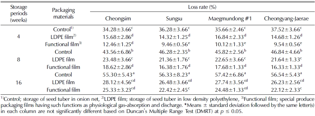 맥문동 (L. platyphylla) 품종별 저장재료에 따른 감모율을 Table 1에 나타내었다. 감모율은 ‘청양재래’ 품종을 대상으로 양파망을 이용하여 저장한 경우 4 주차에 37.52%, 8 주차에 46.84%, 16 주차에 56.54%를 나타낸 반면 동일 품종에서 LDPE film을 이용하여 저장한 경우 감모율이 4 주차에 14.68%, 8 주차에 21.64%, 16 주차에 26.23%를 나타내었고 기능성필름에 저장한 경우 4 주차에 9.54%, 8 주차에 16.33%, 16 주차에 22.12%로 나타나 LDPE film과 기능성 필름을 이용하는 경우 저장기간에 따라 감모율이 낮아지는 것 으로 조사되었다. 이러한 경향은 모든 품종에서 동일한 경향 을 나타내어 맥문동을 LDPE film과 기능성필름을 사용하여 저장하는 경우 모든 품종에서 감모율이 20% 이상 감소하는 것으로 나타났다.