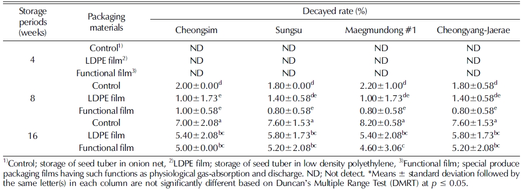 맥문동의 품종별 저장재료에 따른 부패율을 Table 2에 나타 내었다. 부패율은 ‘맥문동 1호’ 품종을 양파망에 저장하는 경 우 8 주차에 2.20%, 16 주차에 8.20%로 나타나 저장기간이 길어짐에 따라 부패율이 증가하는 것을 확인하였다. 반면 ‘맥 문동 1호’ 품종을 LDPE film을 이용하여 저장한 경우 부패율 이 8 주차와 16 주차에 각각 1.00%, 5.40%를 나타내었고 기 능성 필름에 저장하는 경우 8 주차에 0.80%, 16 주차에 4.60%의 부패율을 나타내어 저장재료로 LDPE film과 기능성 필름으로 사용하였을 경우 저장기간에 따라 부패율을 감소시 킬 수 있음을 확인하였다. 이러한 경향은 모든 품종에서 동일 한 경향을 나타내는 것으로 조사되었다 (Table 2, Fig. 2).