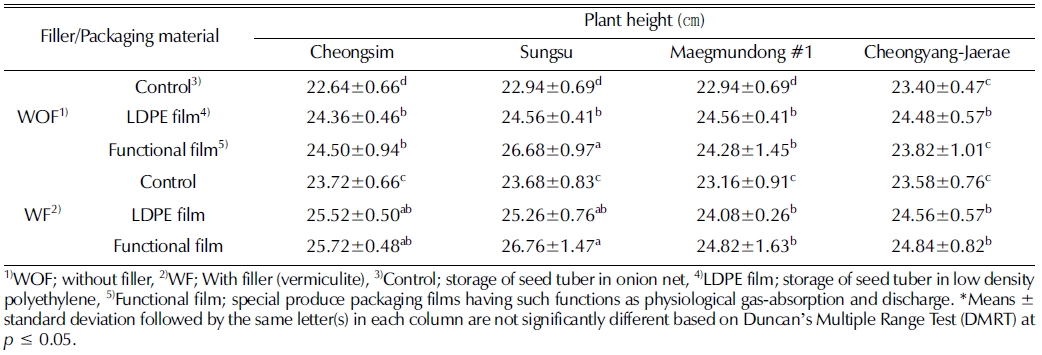 전체적으로 기능성 필름을 사용하여 저장한 경우 양파망을 사용하여 저장한 경우에 비해 2 - 4㎝ 가량 식물 생장이 좋은 것으로 나타났다 (Table 3).