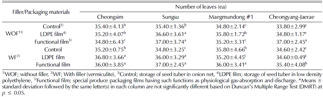 버미큘라이트를 충진제로 사용하고 양파망에 저장한 대조군 에서 각 품종별 엽수가 ‘청심’이 35.20 개, ‘성수’가 34.80 개, ‘맥문동 1호’가 35.80 개, ‘청양재래’가 34.60 개 인데 반하여 동일한 충진제를 사용하고 기능성 필름을 이용하여 저장한 품 종별 엽수는 각각 ‘청심’이 36.00 개, ‘성수’가 37.00 개, ‘맥 문동 1호’ 가 36.00 개, ‘청양재래’ 가 35.10 개로 조사되어 충진제의 유무에 상관없이 기능성 필름를 이용하여 저장하는 경우 맥문동의 엽수는 대체적으로 2 - 3 개 정도 많이 생성한 것을 확인할 수 있었다.