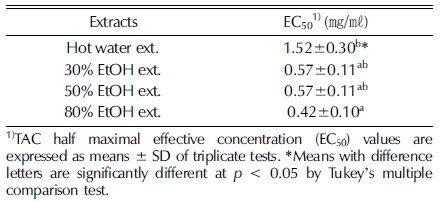 벌개미취 추출물의 항산화 활성은 Cu2+를 50% 환원 시키는 데 필요한 시료의 농도인 EC50 로 Table 1에 나타내었다. 추 출 시 용매의 에탄올 함량이 증가할수록 EC50 값이 낮아지는 경향을 보였으며 그중 80% 에탄올 추출물이 제일 낮은 EC50 값으로 가장 우수한 항산화능을 나타내었으나 다른 에탄올 추 출물과 비교할 때 유의미한 차이는 나타나지 않았다. 이 결과 로부터 에탄올에 의해 phenolic 물질이나 flavonoids와 같은 항산화능을 갖는 유효물질의 용출이 증가하나 에탄올의 비율 에 비례하지는 않는 것을 알 수 있다.