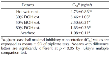 IC50 값은 Table 2에 나타나듯이 열수 추출물은 4.73 ± 0.86㎎/㎖로 측정되었고 30, 50 80% 에탄올 추출물은 각각 5.46 ± 1.03㎎/㎖, 2.50 ± 0.31㎎/㎖, 1.65 ± 0.36㎎/㎖로 측정 되었다. 양성대조군인 acarbose는 1.08 ± 0.11㎎/㎖로 측정되 었다. 벌개미취의 추출물의 항산화능 측정 결과와 마찬가지로 추출 시 용매의 에탄올 함량이 높을수록 α-glucosidase 저해능 이 커지는 경향이 나타났다. 80% 에탄올 추출물의 경우 가장 낮은 IC50 값을 보여 추출물 중 가장 우수한 α-glucosidase 저 해능을 가진 것으로 판단되나 50% 에탄올 추출물과 비교 시 유의미한 차이는 나타나지 않았다.