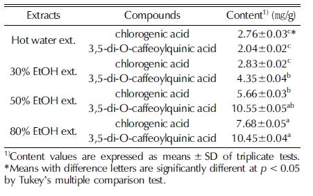 기존에 벌개미취의 유효성분으로 제시된 chlorogenic acid와 3,5-di-O-caffeoylquinic acid의 함량은 추출용매의 에탄올 비율 이 높아짐에 따라 증가하나 30% 에탄올 추출물의 경우 50, 80% 에탄올 추출물에 비해 두 유효성분의 함량이 현저히 적 은데도 불구하고 항산화능을 측정한 결과에서 비슷한 EC50 값 을 보인 것을 보아 분석이 이루어지지 않은 생리활성 성분들 이 이에 영향을 미쳤을 가능성을 생각해볼 수 있다.