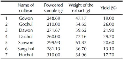 건조된 삽주 품종은 각각 분쇄한 후 50% 에탄올을 이용하 여 상온에서 24 시간 정치하면서 추출한 후 여과하였다. 여과 된 추출액은 감압농축기 (N-1200B, Eyela, Japan)를 이용하여 50℃의 온도조건에서 에탄올을 증발시켜 농축한 다음, 30℃ 온 도 조건의 동결건조기를 이용해 4 일간 건조한 후 최종추출물 의 양을 측정하였다 (Table 1).