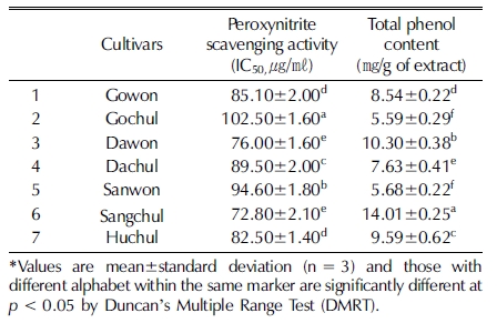 Peroxynitrite 소거능의 측정은 ONOO- 를 50% 저해시키는 농도 (IC50) 값을 ㎍/㎖ 단위로 나타내었다 (Table 2). 측정 결과, 모든 삽주 품종 추출물은 72.8 - 102.5㎍/㎖ 범위의 IC50 농도값을 가졌으며, 상출이 가장 낮은 72.8㎍/㎖의 IC50 값을 가져 가장 우수한 ONOO- 소거능을 보였고, 고출이 102.5㎍/㎖로 가장 높은 IC50 값을 가져 ONOO− 소거능이 가장 낮았다.
