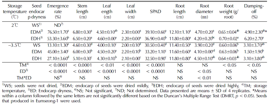 2℃에 저장한 WS는 종자부족으로 파종하지 않아 출아 특성 을 조사할 수 없었으며, EDM과 EDH는 파종 후 각각 76.5%, 53.3% 출아하였다 (Table 1). EDM은 WS에 비해 내 과피 수분함량이 낮아 발아를 억제하면서도 출아에 큰 지장을 주지 않았지만 EDH는 내과피 건조가 심하여 발아에도 불리 하였던 것으로 생각된다. Suh 등 (2017)의 연구에서 EDH는 90%이상 지상부 출현을 보인 것과 대조적인데, 해마다 생산 되는 종자의 특성 차이나 종자 침지, 파종 후 환경, 즉 종자 의 수분흡수나 발아 온도 등 in vitro와의 조건 차이가 작용하 였을 것으로 생각된다.