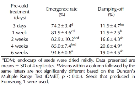 Enhance of emergence rate and damping-off by presowing cold treatment on the -3.5℃ stored EDM1) seeds.