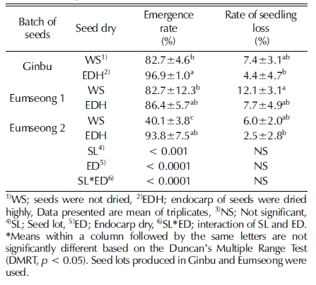 WS와 EDH에서도 냉장 순화처리 효과를 조사하였는데, 냉 장 순화처리를 2 주 하였을 때 WS와 EDH는 각각 82.7%, 86.4% 출아하여 WS 역시 출아가 향상되었다. 그러나 생산지 가 달랐던 음성-2와 진부 종자의 경우 냉장 순화 처리 후 음 성-2의 WS와 EDH의 출아율은 40.1%, 93.8%으로, 진부 종 자의 WS와 EDH는 82.7%, 96.9% 출아하여 종자의 생산지에 따라 출아율에 영향을 줄 수 있으며 저온 저장 전 내과피 건 조처리는 출아율 저하를 방지하는데 효과적임을 알 수 있었다 (Table 3).