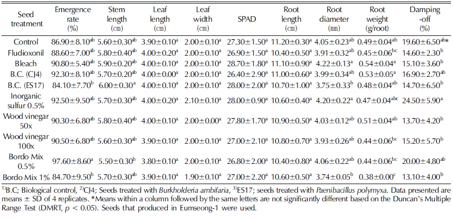 −3.5℃에 저장하였던 음성-1 종자를 파종 전에 종자 처리 하였는데, 처리 방법을 간단히 서술하면 플루디옥소닐은 사용 법에 따라 분의처리 하였고, 락스 소독은 시판 락스를 1/4 희 석하여 10 분간 처리 후 물로 충분히 세척하였으며, 친환경 약 제로는 CJ4 (Burkholderia ambifaria)와 ES17 (Paenibacillus polymyxa) 미생물 부유액에 1 시간 침지 하였으며, 무기유황 수용액, 목초액, 석회보르도액에 설정 농도에 따라 30 분간 침 지 후 물기를 제거하여 1 일 2℃에 보관하였다가 파종하였다.