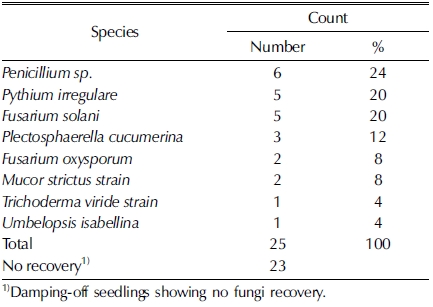 Ziezold 등 (1998)의 연구에서 파종 전 종자에서 뿌리썩음병 유발 병원균이 다수 발견되었으나 이들의 연구에서도 인공 상 토에 파종 후 종자 처리에 의한 입고병 저감 효과는 없었으며, 이병주로부터 병원균 발견이 없었다. 본 연구 결과 역시 종자 처리 효과는 미비하였으며 (Table 4), 병원균의 분리율은 낮았 는데 (Table 5), 입고병 증가 요인으로 파종 전 종자 냉장 처 리 기간이 증가되었을 때 입고병 발생이 증가하는 것을 관찰 하였다 (Table 2).
