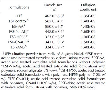 In our study, the particle size of the ultrafine powder of radix of A. gigas Nakai was recorded at 1,467㎚, whereas the particle size was reduced to 585㎚ at the ESFs without polymer adding. Among the ESFs mediated polymers such as HPMCs (HP55, CN40H and AN6) and Na-Alg, the least particle size (323㎚) was achieved in the HP55-ESF (Table 1).