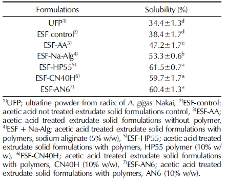 The results in Table 2 show that water solubility was improved in HP55-ESF (61.5%) compared to ultrafine powder of radix of A. gigas Nakai (34.4%), acetic acid not treated ESF control (38.4), acetic acid treated ESF control without polymer (47.2%).