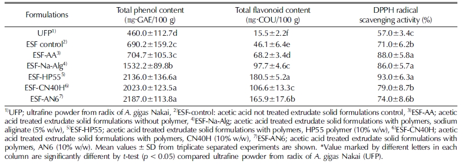 In the same way, extraction of the total phenolic content and antioxidant activity was also increased in the extrudate solid formulations (ESFs) mediated various HPMCs and Na-Alg polymer compared to ultrafine powder of radix of A. gigas Nakai.