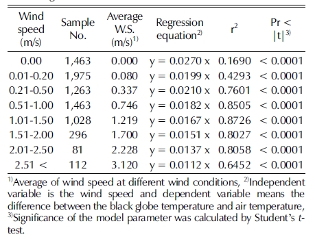 흑구온도 변화에 대한 바람의 영향을 분석하기 위하여 풍속 과 복사에 의한 흑구 내 온도변화 간의 상관관계를 분석한 결 과 풍속이 커질수록 회귀모형의 기울기가 작아져 바람이 복사 의 영향을 감소시키는 것으로 조사되었다 (Table 1).