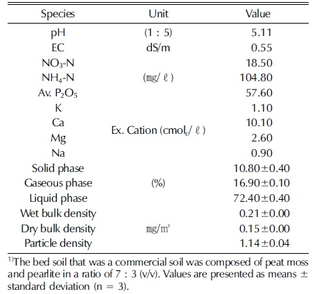 다층베드시설 내에 사용된 상토의 이화학성은 Table 1과 같 았다.