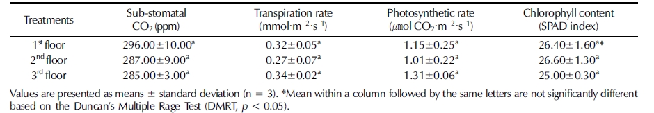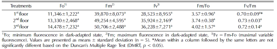 층별 묘삼의 광합성특성 및 엽록소 형광반응은 Table 3과 같았다.