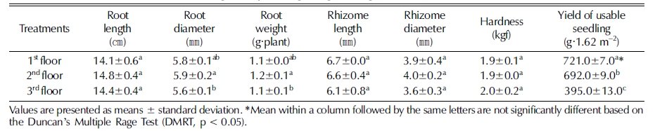 묘삼의 묘소질은 수확 후 각 층별 묘삼의 근장, 근직경, 근 중, 뇌두길이, 뇌두직경, 경도를 측정하였다. 근장, 근직경, 근 중, 뇌두길이, 뇌두직경은 각 층별 각 3 반복으로 채취하여 반 복 당 20 주씩 측정하였고, 경도는 층별 3 주씩 3 반복으로 채취하여 물성측정기 (LTCM-100, AMETEK Chatillon, Largo, Fl, USA)를 이용하여 뇌두에서 1㎝ 아래 부분을 측정 하였다.
